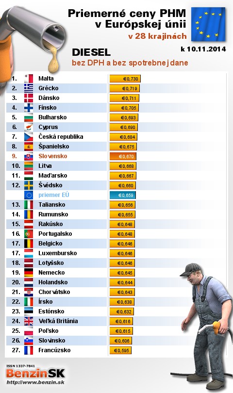 Na Slovensku čerpali motoristi 19. najlacnejšiu motorovú naftu bez dane v rámci Európy: 0,670 EUR za 1L.