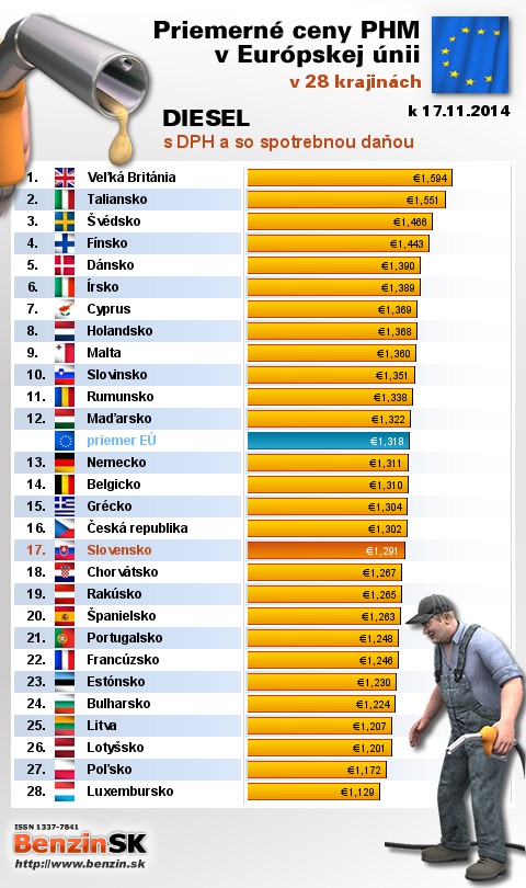 Na Slovensku čerpali motoristi 17. najdrahšiu motorovú naftu s daňou v rámci Európy: 1,291 EUR za 1L.