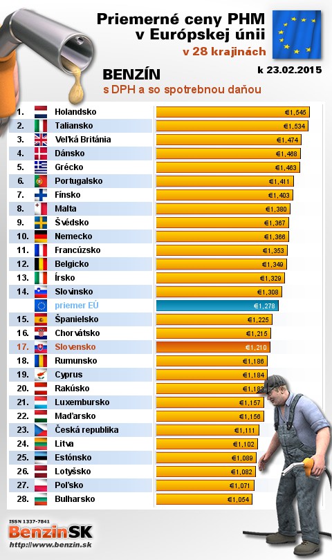 mali v Holandsku, kde motoristi v priemere zaplatili 1,545 EUR za 1L.