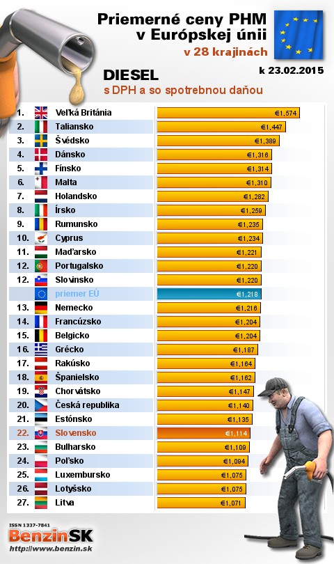 Na Slovensku čerpali motoristi 22. najdrahšiu motorovú naftu s daňou v rámci Európy: 1,114 EUR za 1L.