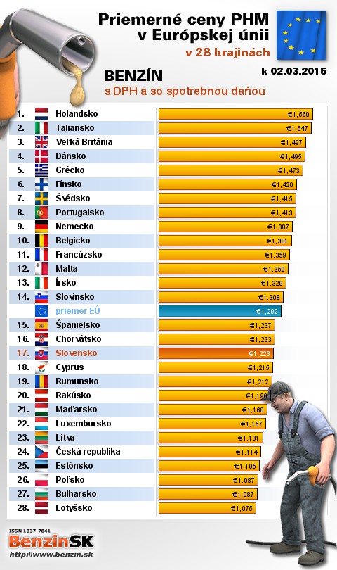 Na Slovensku sme tankovali 1. najlacnejší benzín bez dane v EÚ za priemernú cenu: 0,449 EUR za 1L.