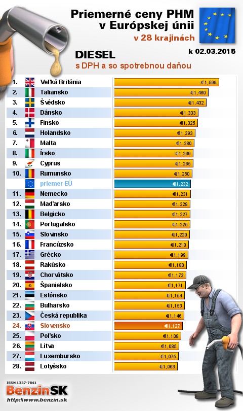 Na Slovensku čerpali motoristi 24. najdrahšiu motorovú naftu s daňou v rámci Európy: 1,127 EUR za 1L.