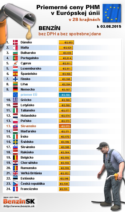 Nasledujúce údaje sú spracované podľa informácií EUROSTATU vydaných 06.08 k 03.08.2015 za obdobie v 31.týždni (od 27.07.2015 - 02.08.2015), ako ich uviedli členské štáty EU. Ceny sú uvádzané v euro. V tabuľke uvádzame štáty Európy podľa toho, za akú priemernú sumu v predchádzajúcich dňoch tankovali.