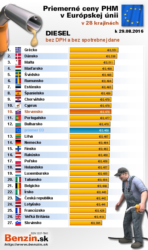 Na Slovensku čerpali motoristi . najlacnejšiu motorovú naftu bez dane v rámci Európy: 0,478 EUR za 1L.