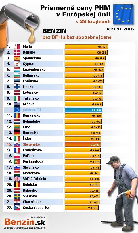 Na Slovensku sme tankovali 8. najlacnejší benzín bez dane v EÚ za priemernú cenu: 0,445 EUR za 1L.