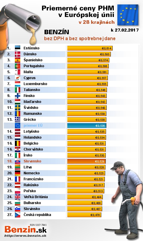 Na Slovensku sme tankovali 10. najlacnejší benzín bez dane v EÚ za priemernú cenu: 0,529 EUR za 1L.