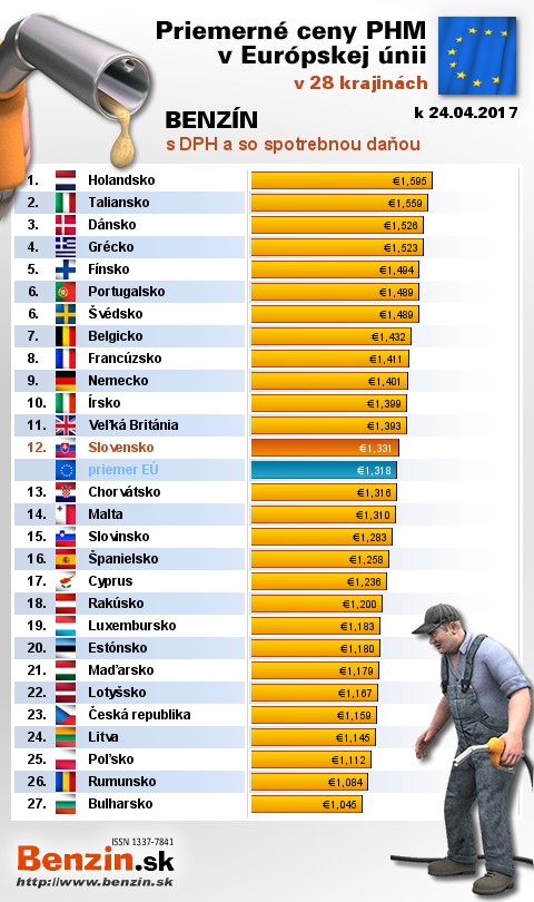 mali v Holandsku, kde motoristi v priemere zaplatili 1,595 EUR za 1L.