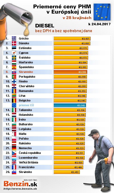 Na Slovensku čerpali motoristi 19. najlacnejšiu motorovú naftu bez dane v rámci Európy: 0,558 EUR za 1L.