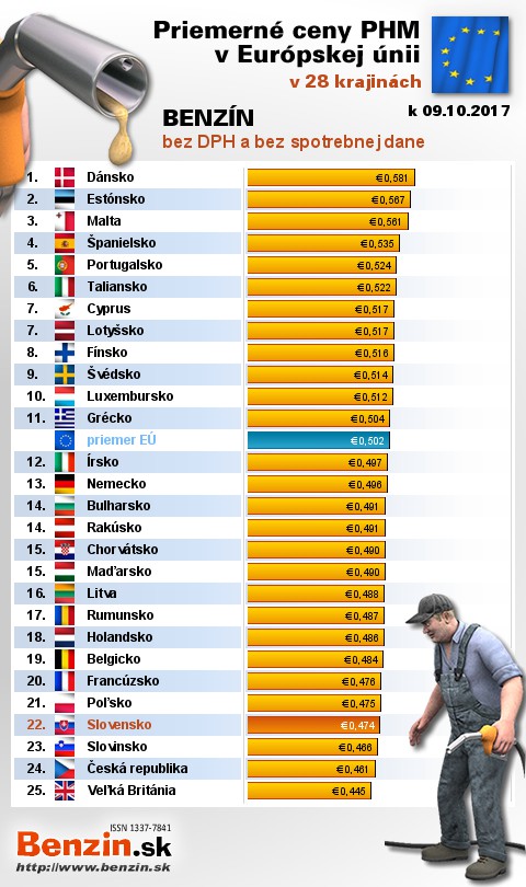 Na Slovensku sme tankovali 4. najlacnejší benzín bez dane v EÚ za priemernú cenu: 0,474 EUR za 1L.