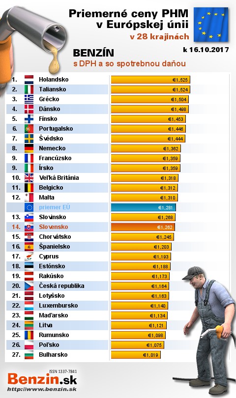 mali v Holandsku, kde motoristi v priemere zaplatili 1,525 EUR za 1L.