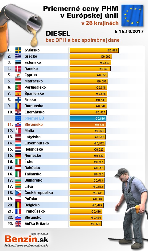 Na Slovensku čerpali motoristi 13. najlacnejšiu motorovú naftu bez dane v rámci Európy: 0,531 EUR za 1L.