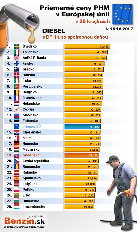 Na Slovensku čerpali motoristi 19. najdrahšiu motorovú naftu s daňou v rámci Európy: 1,136 EUR za 1L.