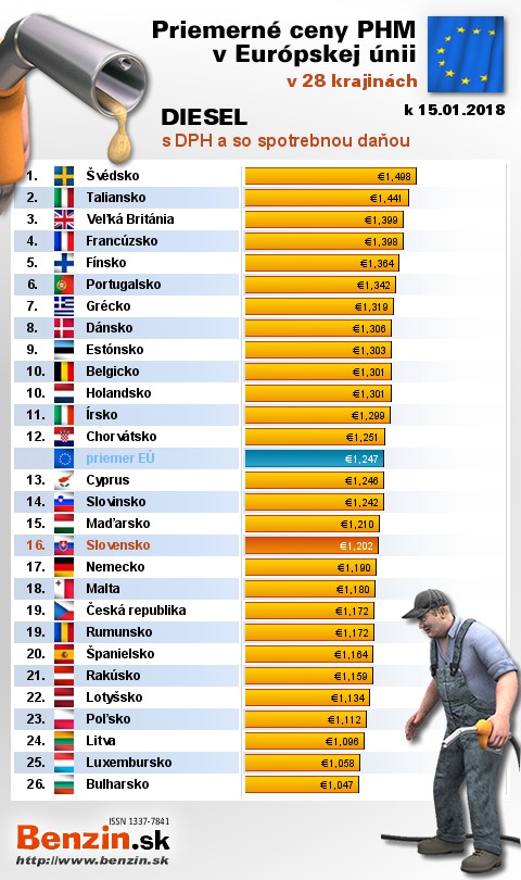 Nasledujúce údaje sú spracované podľa informácií EUROSTATU vydaných 18.01 k 15.01.2018 za obdobie v 2.týždni (od 08.01.2018 - 14.01.2018), ako ich uviedli členské štáty EU. Ceny sú uvádzané v euro. V tabuľke uvádzame štáty Európy podľa toho, za akú priemernú sumu v predchádzajúcich dňoch tankovali.
