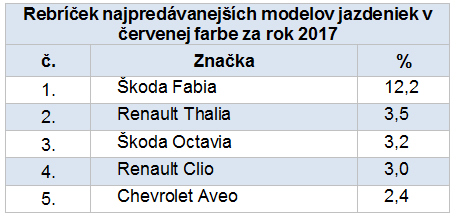 Už dávno neplatí, že červené autá vyhľadávajú iba ženy. V minulom roku si ju vyberali až v dvoch tretinách muži. Zo značiek áut v červenej farbe sa najviac predávali Škoda, Renault a Peugeot. Vyplýva to z analýzy výsledkov predajov za rok 2017 zameranú na obľúbenosť vozidiel červenej farby, ktorú pripravili odborníci najväčšieho tuzemského predajcu jazdeniek AAA AUTO. Z analýzy ďalej vyplýva, že červená farba je šiestou najobľúbenejšou medzi zákazníkmi AAA AUTO.