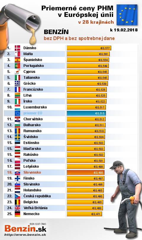 Na Slovensku sme tankovali 8. najlacnejší benzín bez dane v EÚ za priemernú cenu: 0,498 EUR za 1L.