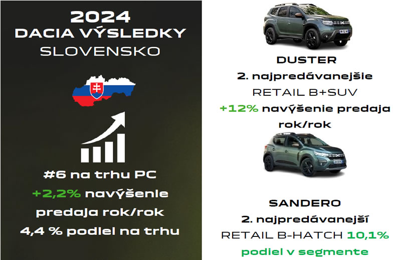 V roku 2024 získala Dacia podiel na tomto trhu 4,1 % a ukončila rok s viac ako 4000 predanými kusmi. Keď pred 3 rokmi bola na 11. priečke, dnes jej patrí 7. miesto predajov na Slovensku. Udržala si pozíciu minulého roka. V segmente Retail je 6. najčastejšia voľba zákazníkov (trhový podiel 6,6 %).