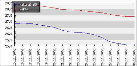 | | Nafta: | 1,471 € | | Benzin 95: | 1,488 € | | Benzin 95+: | 1,499 € | | Benzin 99+: | 1,613 € | | LPG: | 0,639 € | | AdBlue: | 0,890 € |