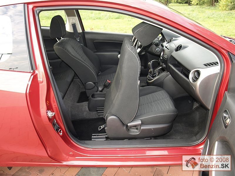 Trojdverová karoséria nesie rovnako atraktívne krivky, ako jej päťdverový vzor. Pôsobí však dynamickejšie, čo dodáva automobilu ešte viac na šarme. Rozmerné, pretiahnuté svetlomety usmievavá maska, to všetko ostalo. Zachovali sa aj navlas rovnaké vonkajšie rozmery karosérie. Podobne aj interiér bol pre nás už dobre známy. Cítili sme sa v ňom príjemne. Znovu sme sa vyskúšali skrinku pred spolujazdcom, ktorá má v odklápacích dvierkach otvor, kam sa dá bez ich otvorenia zasunúť dokumentácia alebo automapa a podobne. Multifunkčný volant má, ako pri päťdverovej verzii, len výškové nastavovanie. Materiály použité v interiéri sú kvalitné. Prístrojový panel ostal nezmenený, všetky ovládacie prvky sú veľmi dobre dostupné. Vo výbave nechýbala automatická klimatizácia, či znovu zlodejom odolné rádio. Jeho tvar a najmä rozmer ladí len s interiérom Mazdy 2. Takže zlodeji ho do iných automobilov nemajú dôvod kradnúť. V kufri sme našli rezervné koleso určené na núdzový dojazd.