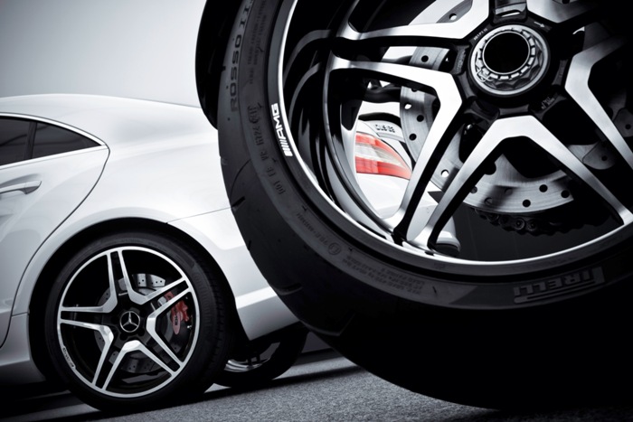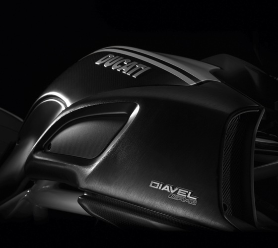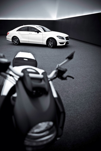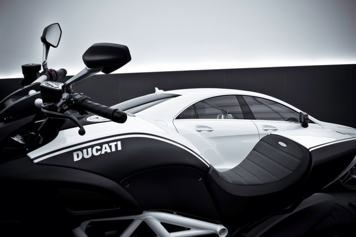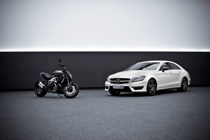 Nový motocykel Ducati: Diavel AMG Special Edition predstavený prvý krát na 64. Medzinárodnej automobilovej výstave vo Frankfurte je inšpirovaný dizajnom značky AMG. Naopak optickú príbuznosť s týmto osobitným motocyklom Ducati tu preukazuje CLS 63 AMG s komponentmi z dielne AMG Performance Studio.
