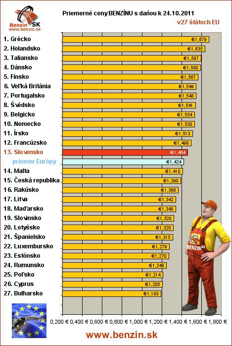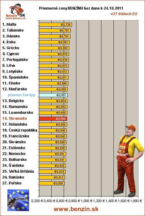 Na Slovensku sme tankovali 12. najlacnejší benzín bez dane v EÚ za priemernú cenu: 0,650 EUR za 1L.