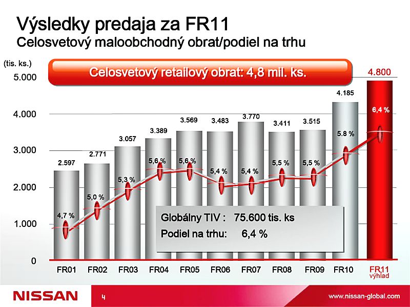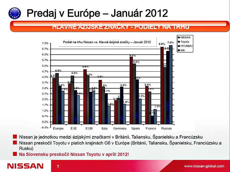 Spoločnosť Nissan potvrdila, že v Európe nikdy nebola silnejšia. Za finančný rok 2011, ktorý skončil 31. marca, oznámila rekordný objem predaja, ktorý prekonal 713 000 vozidiel. Pozitívne výsledky zaznamenáva Nissan aj na Slovensku, kde od januára 2012 jeho podiel na trhu rastie.