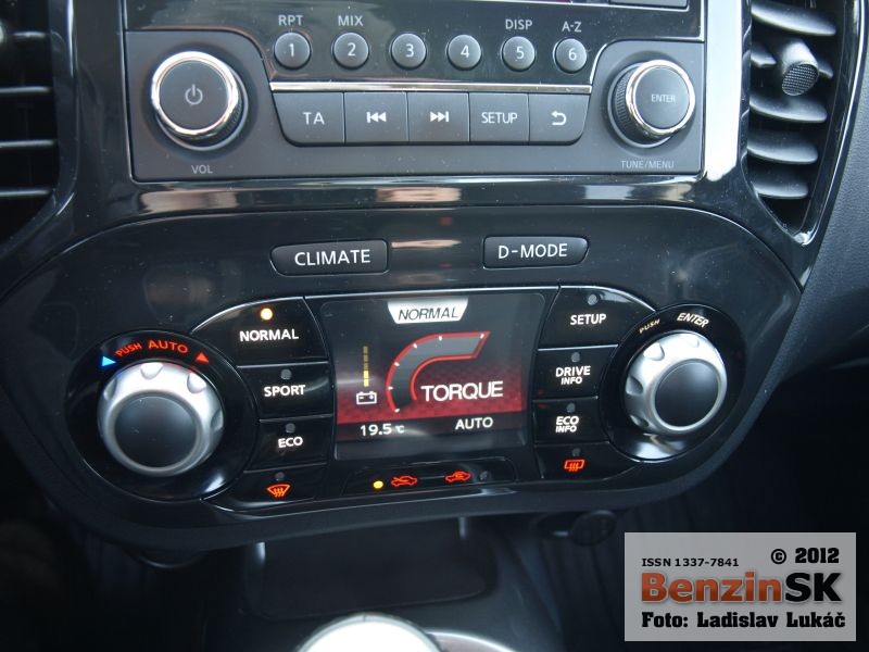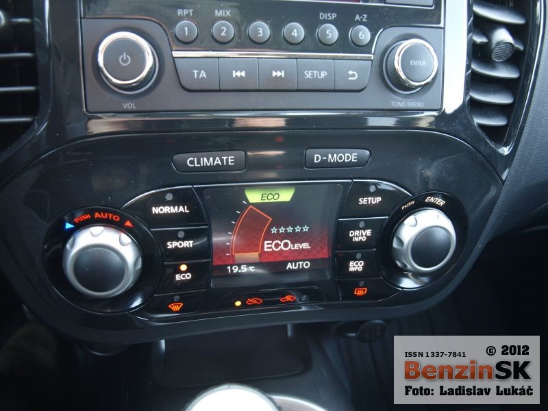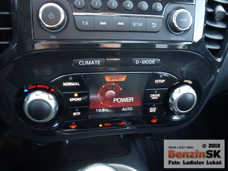 My sme k vybaveniu Acenta mali pribalené aj dva balíky, „Sport“, ktorá sa obsahuje atraktívne čalúnenie sedadiel a „Dynamic“ s automatickou klimatizáciou a systémom Nissan dynamic control. Práve tento elektronický systém ešte viac a zatraktívňuje šoférovanie vozidla. Ponúka mód, normal, sport a eco, ktoré upravujú charakteristiky motora. Pri módoch sa mení aj farba osvetlenia prístrojov a symboly na centrálnom displeji. Dômyselné je aj podsvietenie tlačidiel, kde tie isté tlačidlá menia svoju funkciu, takže odporúčam sa pred stlačením pozrieť na ikonku, aby ste sa nepomýlili.