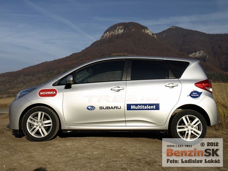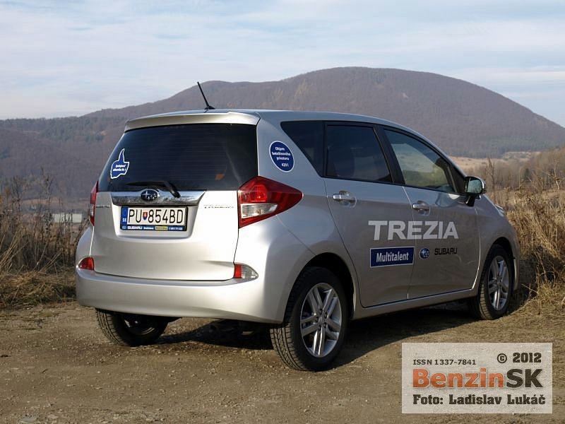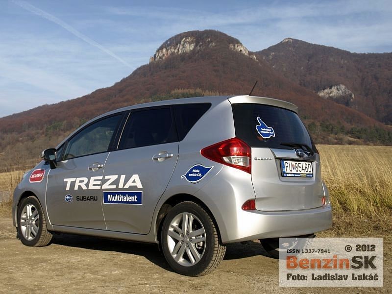 Pohľad na karosériu a pod kapotu nás presvedčil o tom, že tento automobil má spoločné črty s Toyotou Verso S, ktoré predstavili v roku 2009. Skutočne, základ Subaru Trezia, ktorá je minuloročnou novinkou na našom trhu tvorí práve spomínaná Toyota. Názov Toyota nájdete nielen na všetkých oknách, ale aj pod kapotou, kde sa nachádza malolitrážny atmosférický motor už spomínanej značky. Subaru Trezia odlišuje od brata najmä tvar prednej masky so šiestimi hviezdičkami v znaku a predné reflektory. Inak spolupráca pri výrobe automobilov nie je pre značku Subaru ničím novým. Pamätáme si ešte výrobu Subaru Justy v maďarskej fabrike Suzuki v Ostrihome. V každom prípade Subaru modelom Trezia urobilo prielom na trh s malými mestskými MPV vozidlami, ktoré doteraz nemalo vo svojom portfóliu.