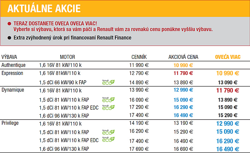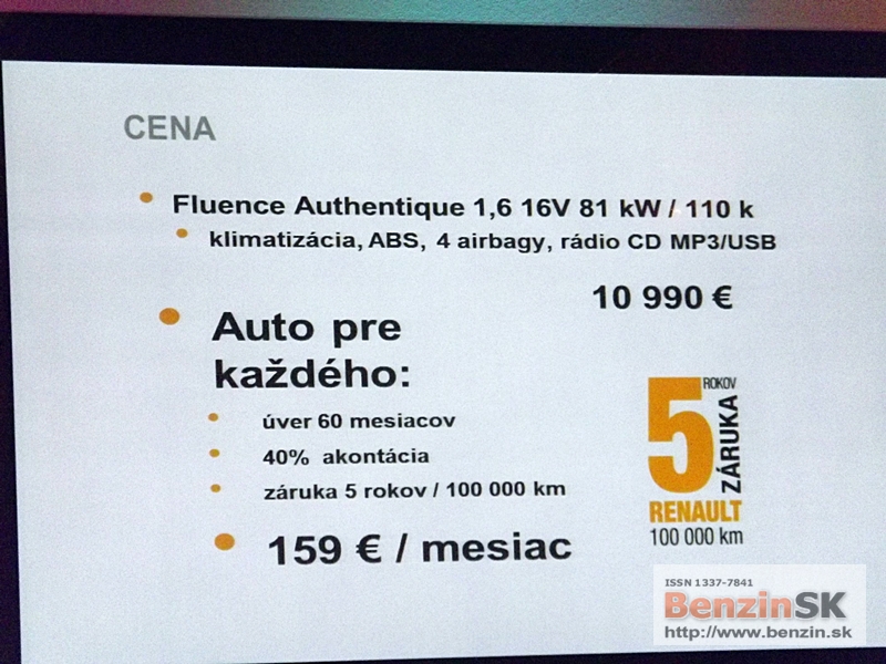 Aktuálny cenník s akciami: ![]() Video: Tlačová beseda - Uvedenie vynoveného Renault Fluence na slovenský trh. (Jana Rajcová - PR manažérka Renault Slovensko, Peter Slánský - produktový manažér Renault Slovensko) Video: Tlačová beseda - Odhalenie vynoveného Renault Fluence. Fotogaléria k článku: