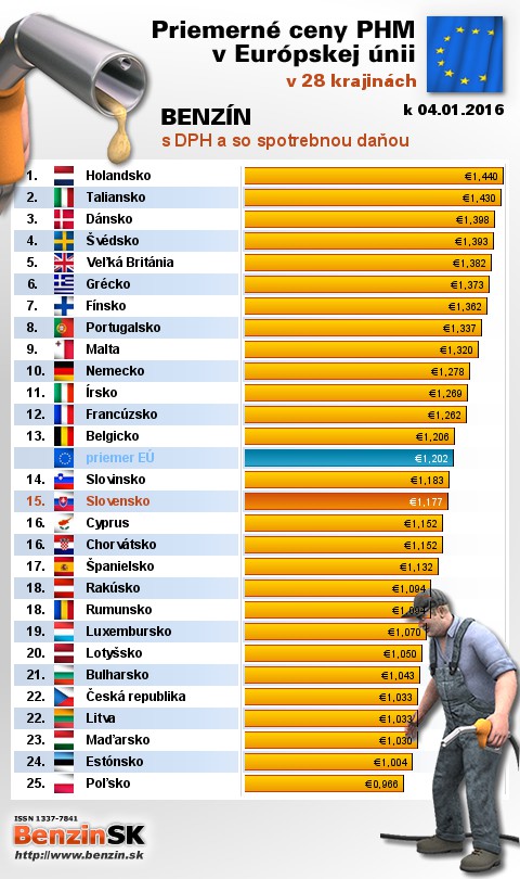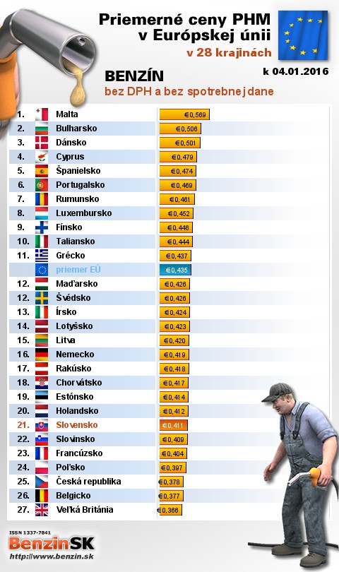 Na Slovensku sme tankovali 7. najlacnejší benzín bez dane v EÚ za priemernú cenu: 0,411 EUR za 1L.