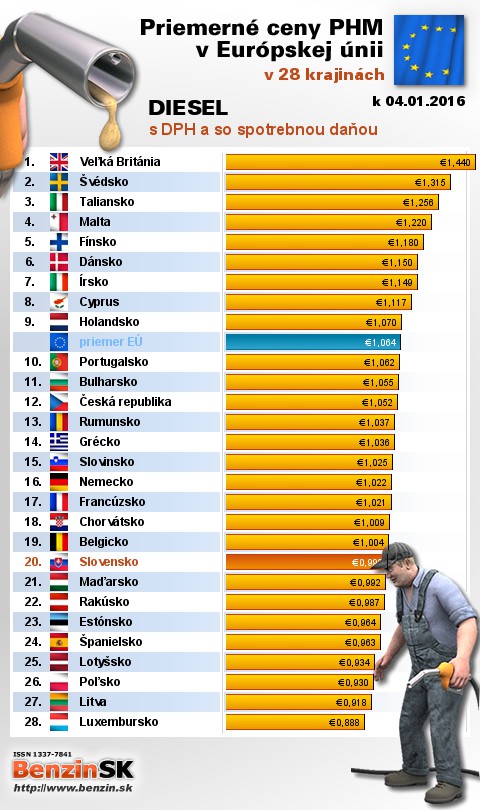 Na Slovensku čerpali motoristi 20. najdrahšiu motorovú naftu s daňou v rámci Európy: 0,999 EUR za 1L.
