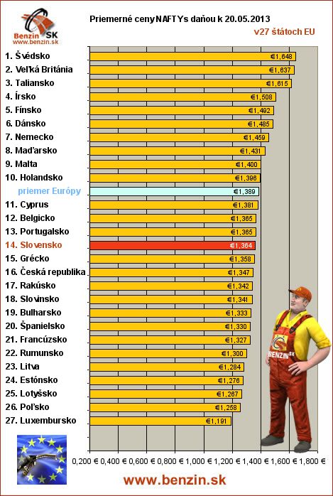 mali vo Švédsku, kde motoristi v priemere zaplatili 1,648 EUR za 1L.