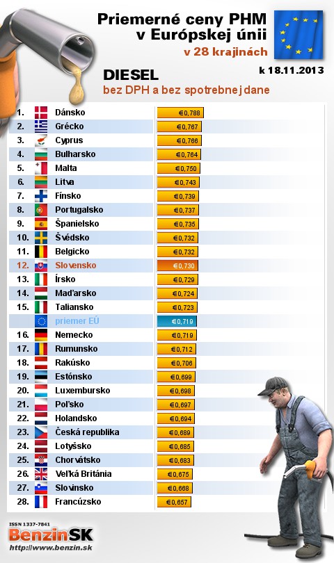 Na Slovensku čerpali motoristi 17. najlacnejšiu motorovú naftu bez dane v rámci Európy: 0,730 EUR za 1L.