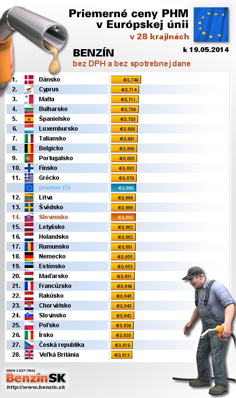 Na Slovensku sme tankovali 15. najlacnejší benzín bez dane v EÚ za priemernú cenu: 0,665 EUR za 1L.