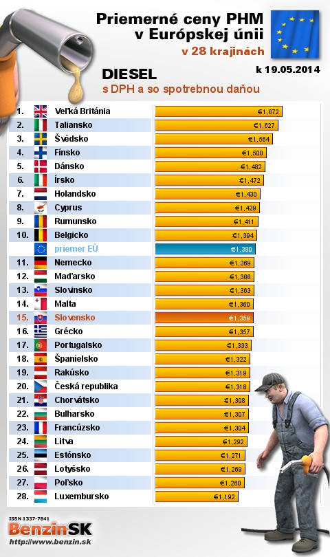 Na Slovensku čerpali motoristi 15. najdrahšiu motorovú naftu s daňou v rámci Európy: 1,359 EUR za 1L.
