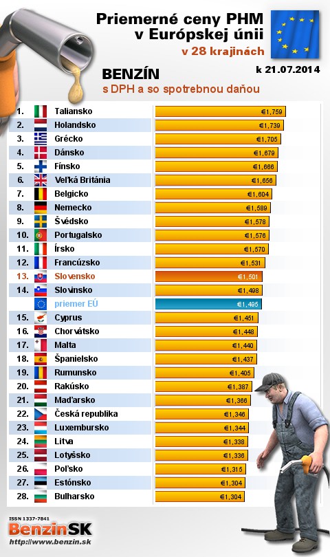 Na Slovensku sme tankovali 13. najdrahší benzín s daňou v EÚ za priemernú cenu: 1,501 EUR za 1L.