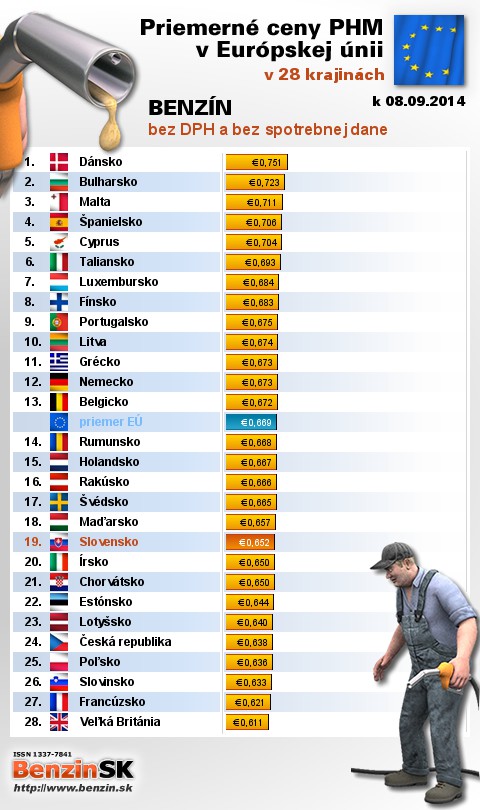 Na Slovensku sme tankovali 10. najlacnejší benzín bez dane v EÚ za priemernú cenu: 0,652 EUR za 1L.