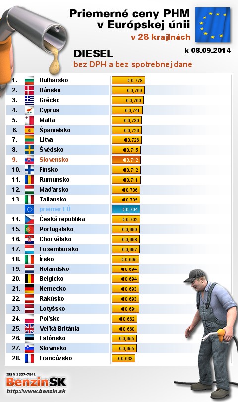 Na Slovensku čerpali motoristi 20. najlacnejšiu motorovú naftu bez dane v rámci Európy: 0,712 EUR za 1L.