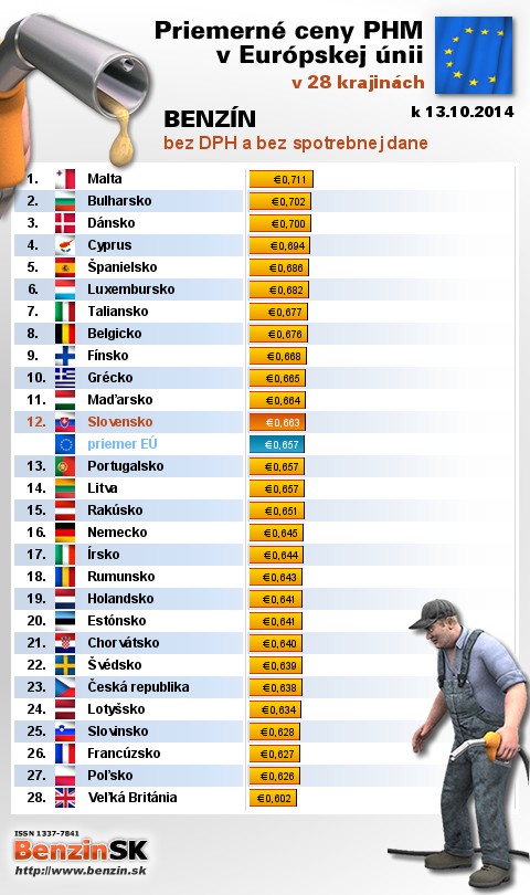 Na Slovensku sme tankovali 17. najlacnejší benzín bez dane v EÚ za priemernú cenu: 0,663 EUR za 1L.