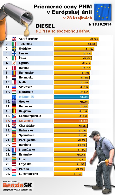 Na Slovensku čerpali motoristi 17. najdrahšiu motorovú naftu s daňou v rámci Európy: 1,326 EUR za 1L.
