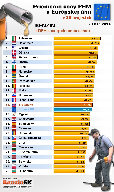 Na Slovensku sme tankovali 15. najdrahší benzín s daňou v EÚ za priemernú cenu: 1,417 EUR za 1L.