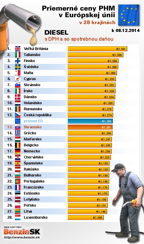 Na Slovensku čerpali motoristi 13. najdrahšiu motorovú naftu s daňou v rámci Európy: 1,261 EUR za 1L.