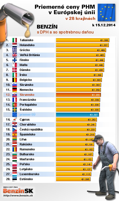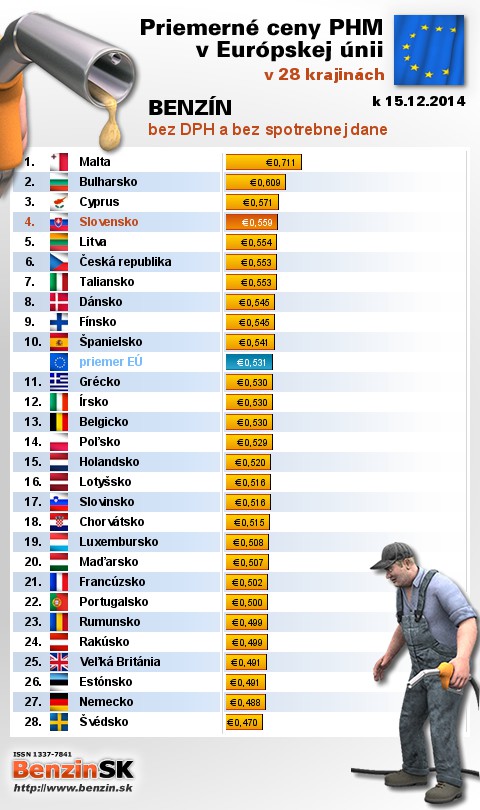 Na Slovensku sme tankovali 25. najlacnejší benzín bez dane v EÚ za priemernú cenu: 0,559 EUR za 1L.