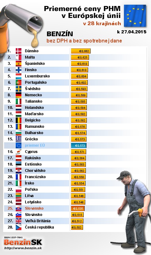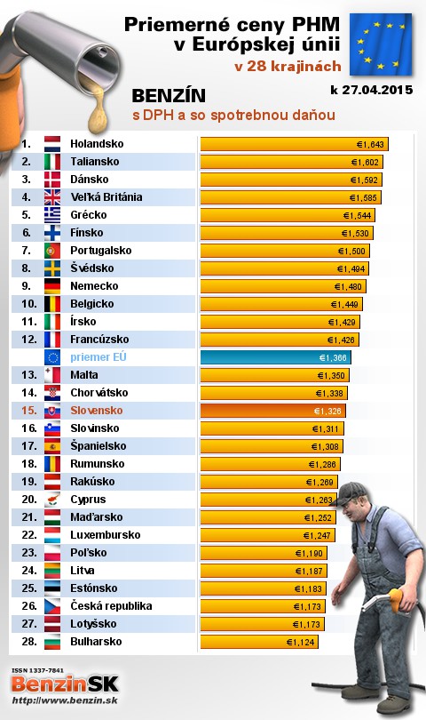 Nasledujúce údaje sú spracované podľa informácií EUROSTATU vydaných 29.04 k 27.04.2015 za obdobie v 17.týždni (od 20.04.2015 - 26.04.2015), ako ich uviedli členské štáty EU. Ceny sú uvádzané v euro. V tabuľke uvádzame štáty Európy podľa toho, za akú priemernú sumu v predchádzajúcich dňoch tankovali.
