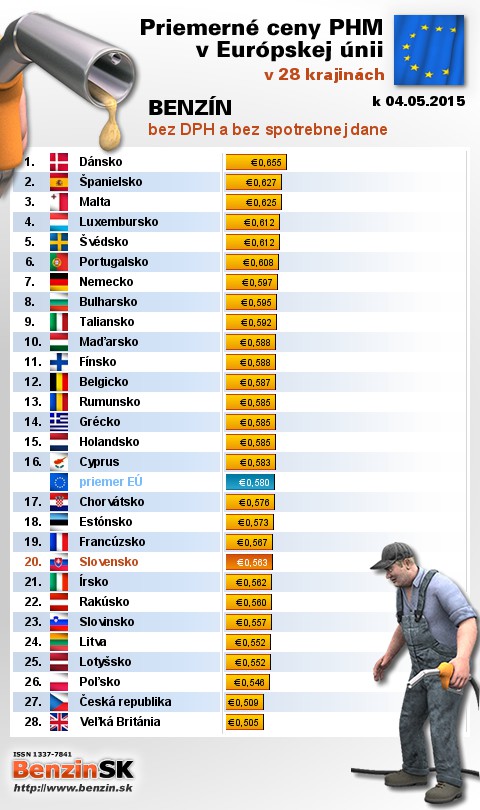 Na Slovensku sme tankovali 9. najlacnejší benzín bez dane v EÚ za priemernú cenu: 0,563 EUR za 1L.