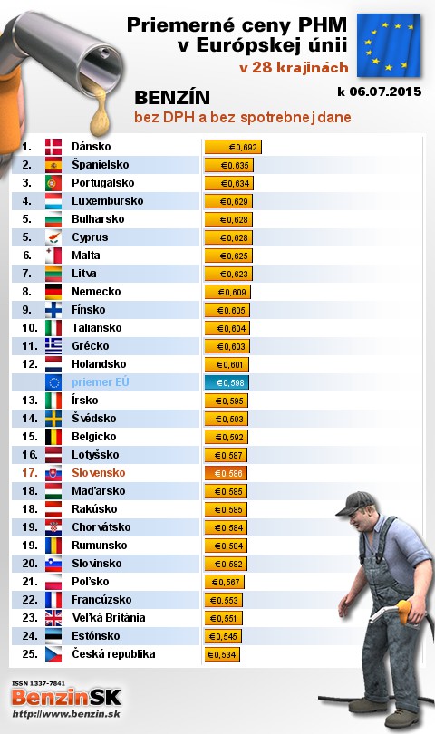 Na Slovensku sme tankovali 9. najlacnejší benzín bez dane v EÚ za priemernú cenu: 0,586 EUR za 1L.