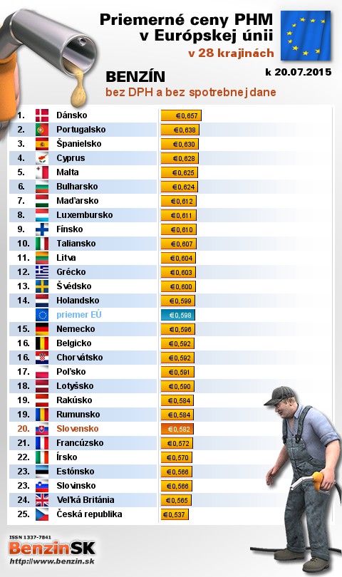 Na Slovensku sme tankovali 6. najlacnejší benzín bez dane v EÚ za priemernú cenu: 0,582 EUR za 1L.
