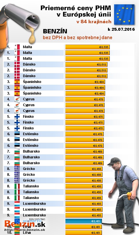 Najlacnejší benzín bez dane v EÚ: