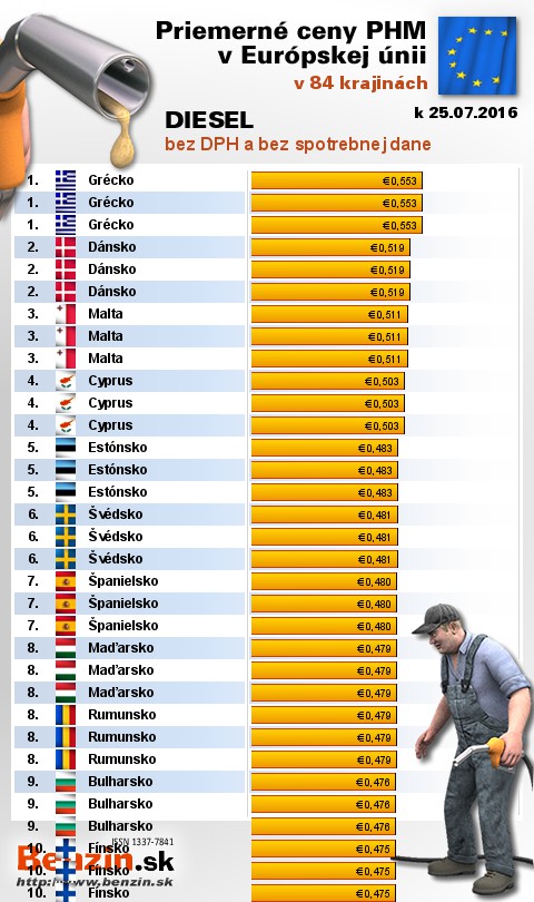mali v Grécku, kde motoristi v priemere zaplatili 0,553 EUR za 1L.