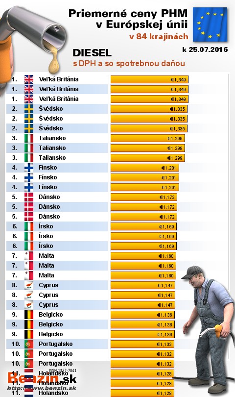 Na Slovensku čerpali motoristi 19. najdrahšiu motorovú naftu s daňou v rámci Európy: 1,051 EUR za 1L.