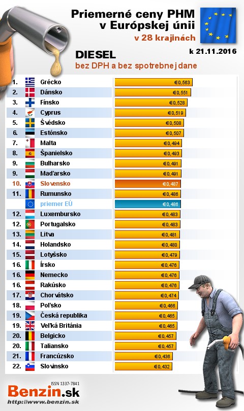 Na Slovensku čerpali motoristi 13. najlacnejšiu motorovú naftu bez dane v rámci Európy: 0,487 EUR za 1L.